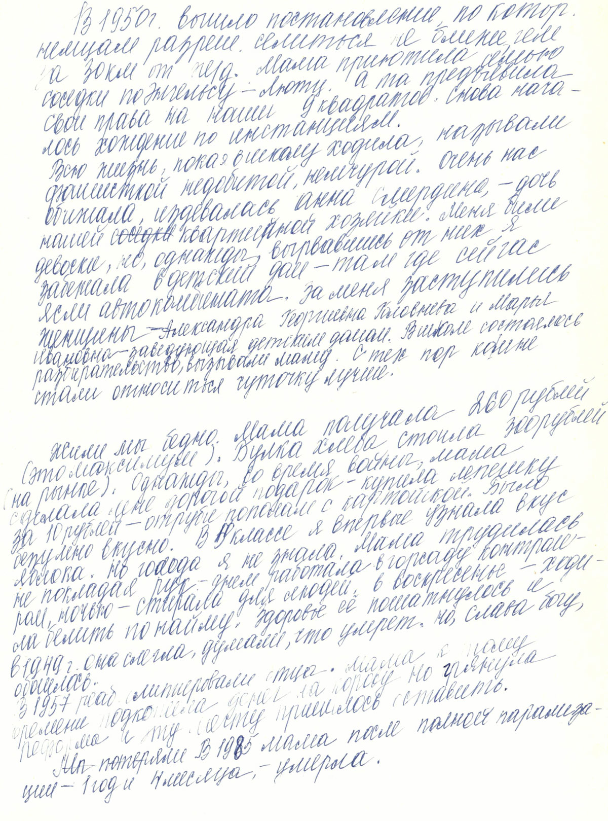 Жили мы бедно. Мама получала 260 рублей (это максимум). Булка хлеба стоила 300 рублей (на рынке). Однажды, во время войны, мама сделала мне дорогой подарок - купила лепешку за 10 рублей - отруби пополам с картошкой. Было безумно вкусно. В 5 классе я впервые узнала вкус яблока. Но голода я не знала. Мама трудилась, не покладая рук: днем работала в Горсаду контролером, ночью стирала для людей, в воскресенье ходила белить по найму. Здоровье ее пошатнулось и в 1949 г. она слегла, думали, что умрет. Но, слава богу, обошлось.