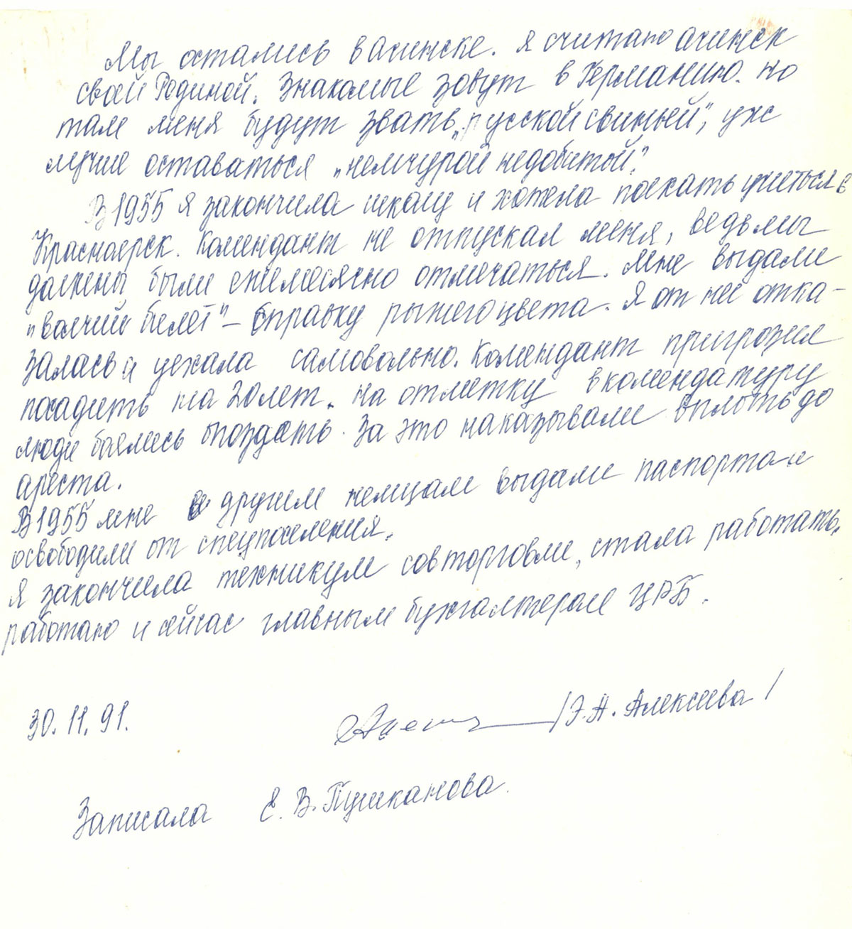 30.11.91 Э.А. Алексеева записала Е. В. Тушканова