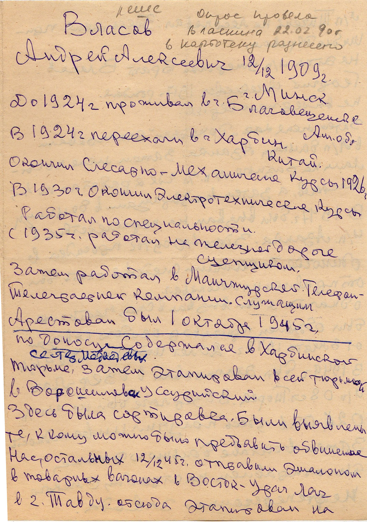 В 1947 г. был вызван на переследствин л/п Азанка. Здесь 40 суток просидел в одиночке. По окончании следствия опять был отправлен на лесоповал.