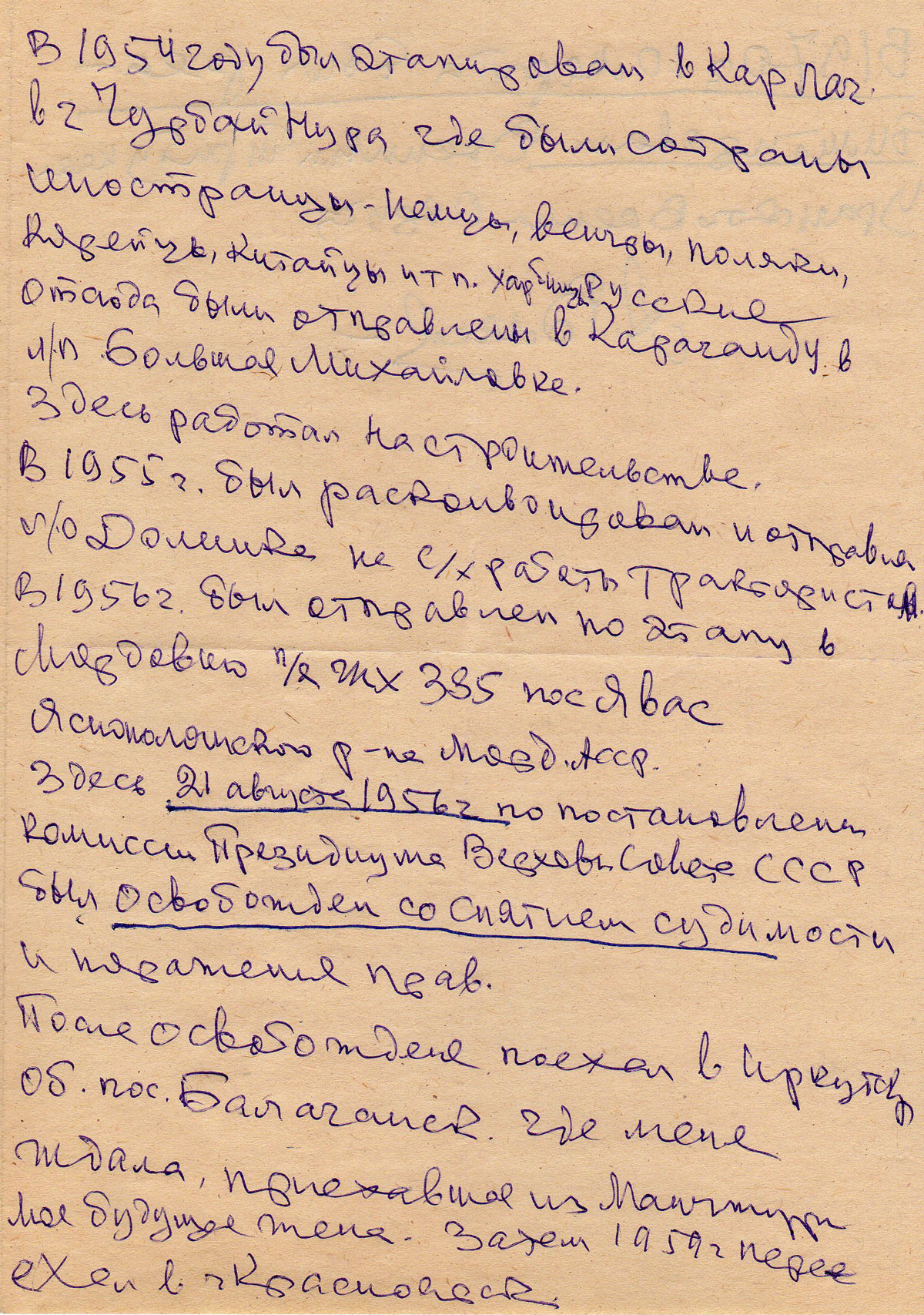 В 1954 году был этапирован в Карлаг в г. Чурбай Нура где были собраны иностранцы — немцы, венгры, поляки, корейцы, китайцы и т. п. (Харбин) Русские были отсюда отправлены в Караганду в л/п Большая Михайловка.