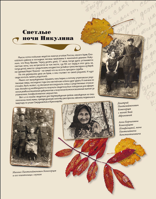 ...Попрощалась я с Алипием Пантелеймоновичем и Марией Архиповной, домой приехала, а меня, оказывается, две незнакомые женщины уже четыре часа ждут и сразу старые фотографии показывают: на одной мама в юности, на другой - дядя мой, а рядом с ними одна из этих женщин - Александра Ефимовна Золотухина. Другая гостья оказалась тоже из рода Комогорцевых - Нина Георгиевна. Разыскали меня тоже «по цепочке», чтобы о встрече июльской поговорить и о книге памяти, которую они хотят вместе написать, оставили в нее свои записи-воспоминания. По словечку да по строчке родится, думаю, эта печальная повесть с оптимистичным эпилогом, утверждающим Трудолюбие, Стойкость, Память и Жизнь. А эпиграфом станут слова, высеченные на памятнике, установленном забайкальцами прошлым летом в селе Никулино: «Жертвам репрессий. Человеческая боль от несправедливости не притупляется никогда».