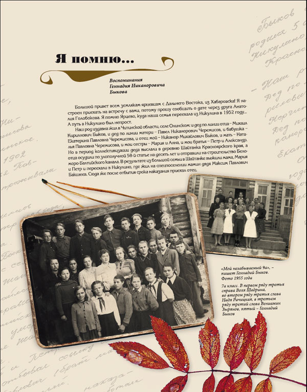 Наш род издавна жил в Читинской области, селе Олинском: и дед по линии отца - Михаил Кириллович Быков, и дед по линии матери - Павел Никанорович Черемисов, и бабушка -Екатерина Павловна Черемисова, и отец мой - Никанор Михайлович Быков, и мать - Наталья Павловна Черемисова, и мои сестры - Мария и Анна, и мои братья - Петр и Александр. Но в период коллективизации деда выслали в деревню Шайтанка Красноярского края, а отца осудили по злополучной 58-й статье на десять лет и отправили на строительство Беломоро-Балтийского канала. В результате из большой семьи в Шайтанке выжили мама, Мария и Петр и переехали в Никулино, где жил на спецпоселении мамин дядя Максим Павлович Бакшеев. Сюда же после отбытия срока наказания приехал отец.
