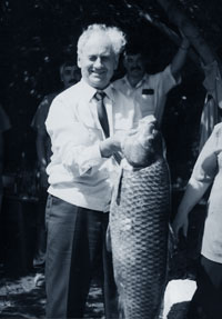 И сейчас по возможности мы видимся друг с другом. Фото встречи, например, с Толей Флигинским я прилагаю. А другой снимок сделан, когда на берегу Беловского моря мы отмечали с товарищами День Железнодорожника. А этот экземпляр в руках - сазан - вырос для нас на угодьях Беловского моря.