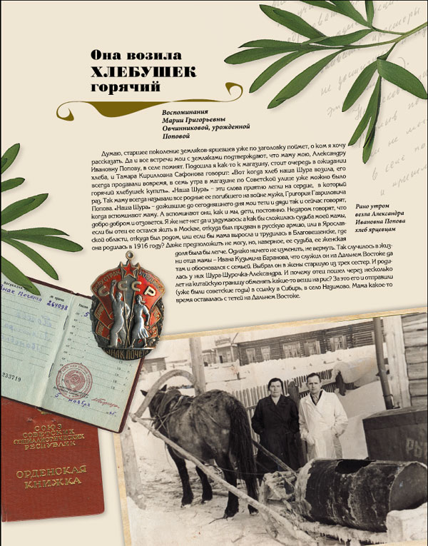 Несли ее в окружении домашних, ею выращенных цветов (в палисадниках и на лугах уже все замерзли). Сельчане подходили, вливались в процессию... Все говорили, что помнят аромат хлеба, который сопровождал маму всю жизнь. Ах, какой в Ярцеве пекли хлеб! Объеденье! И хлеб этот соседи, друзья, товарищи по работе, знакомые и незнакомые люди, оказавшиеся в селе, получали из ее натруженных рук... И за этот хлеб представили маму к награде. К ордену! Нет, в середине шестидесятых годов двадцатого века еще не стало привычкой вручать награды к праздникам, юбилеям, памятным датам. Еще только-только правительственные награды «проторили дорогу» на фермы к лучшим дояркам и на поля к лучшим комбайнерам. И среди них в нашем Ярцеве орденоносцев были пока единицы. А тут возчица хлеба... Так ведь не за название профессии вручили маме высокую награду! А за ее уважение к сельчанам, которое она ежедневно проявляла, привозя им вовремя, к завтраку и ужину, горячий хлебушек - в любую погоду, при любом самочувствии... Земляки оценили и ее материнский, сестринский подвиг. Ее стойкость русской женщины, несгибаемость и в то же время мягкость характера. Я не знаю, кто первый предложил кандидатуру мамы к награде. Помню только с тех лет, что обсуждалось это и в трудовом коллективе, и в сельсовете, и депутатами, и парткомом, и райкомом КПСС. И все, и везде сказали - да, Александра Ивановна Попова достойна ордена. Она позвонила мне в Кривляк, что едет получать орден в Енисейск. Для меня это было неожиданным событием. Не знаю, было ли ей заранее известно, или эта радость, это признание так же потрясли ее. Что чувствовал тогда Сережа? Он никогда со мной не делился. Но то, что он бережно хранит и орден, и орденскую книжку, и вырезку из газеты, в которой некрасовскими словами оценили труд, да и весь жизненный путь его матери, говорит о том, что он гордится...
