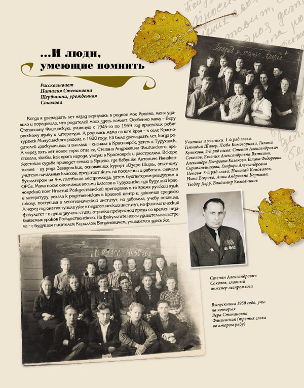 Потом жила в Тольятти, снова - в Енисейске. И вот вернулась в Ярцево. Настоял муж - Геннадий Щербинин, для которого это тоже родные места. Что зовет человека в Ярцево? Наверное, бескрайняя тайга и необъятный Енисей, совсем рядом с которым наш дом... Воздух, наполненный запахом медовых трав. Алые зори, с которыми мы просыпаемся... И люди, умеющие помнить... Кстати, мой дядя, Анатолий Степанович Флигинский, тоже помнит село, учителей, школьных друзей и шлет всем ярцевцам поклон...