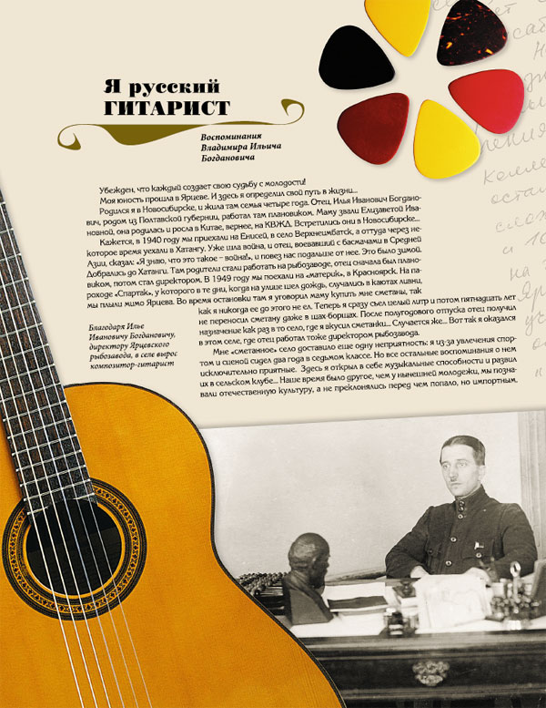 Впрочем, мы тетке были подвержены моде, например, носили брюки-клеш по 40 - 45 сантиметров в ширину, подметая пыль ярцевских дорог и тротуаров. Но слушали мы арии из опер и инструментальную музыку, что выпускали на пластинках. Это в основном баян, гитара, аккордеон. Кстати, в то время жил в Ярцеве великолепный аккордеонист поляк Константин Химичевский. Он был сослан на поселение из-за брата, который оказался в оккупации. Костя учился в консерватории, оттуда его и «взяли». Он Жил в Ярцеве года три до меня и еще после моего отъезда. Работал в Доме культуры. Женился. Позже я слышал от ярцевских ребят, что он с женой уехал в Польшу, когда был реабилитирован. От него я впервые узнал о нотах, он и помог мне в них разобраться, хотя предварительно сказал, что нот для гитары не знает. Сам он классно играл на аккордеоне, аккомпанировал певцам, и ребята часто просили его сыграть нашу любимую пьесу - «Чардаш» Монти. Константина Химичевского я и считаю своим первым учителем теории музыки. Он впоследствии руководил различными оркестрами и ансамблями, включая неаполитанский. Были в нашем Ярцеве и другие музыкальные таланты. Помню, был музыкант из Москвы, тетке ссыльный, он организовал небольшой оркестр струнных инструментов - мандолины, балалайки, гитары (Успенский? - ред.). И он «открыл» в селе мальчика, который имел абсолютный слух и с ходу подбирал любые мелодии. В мое время был духовой оркестр, которым руководил Шамиль Наизович Галеев, художник и музыкант. Я играл в этом оркестре... Рассказывать о ярцевской жизни можно бесконечно, ибо молодость -самое интересное время жизни...