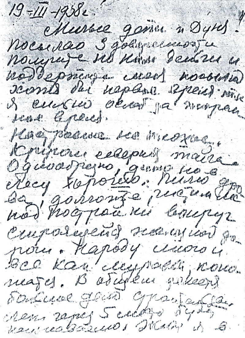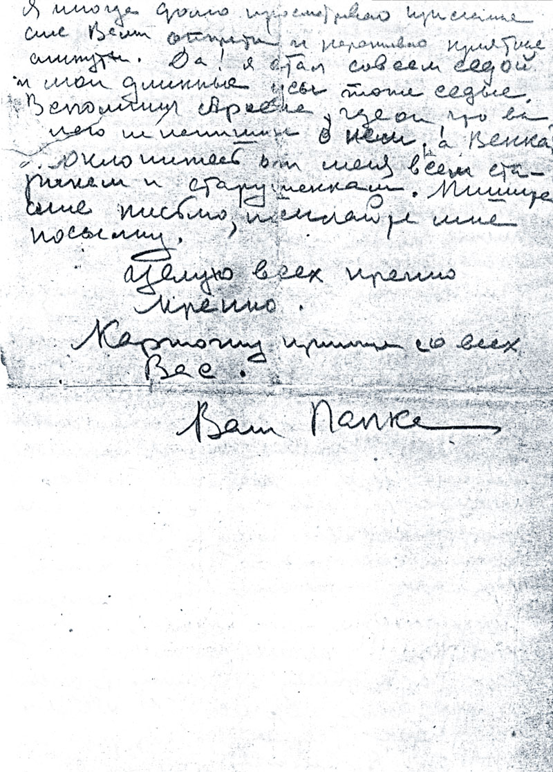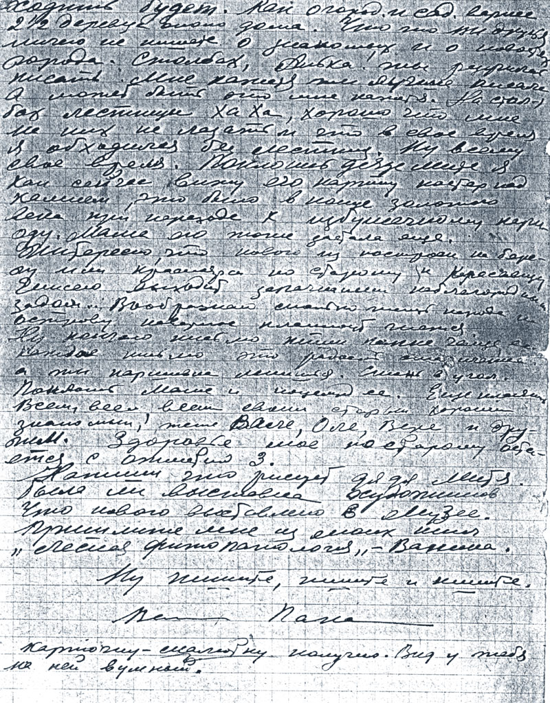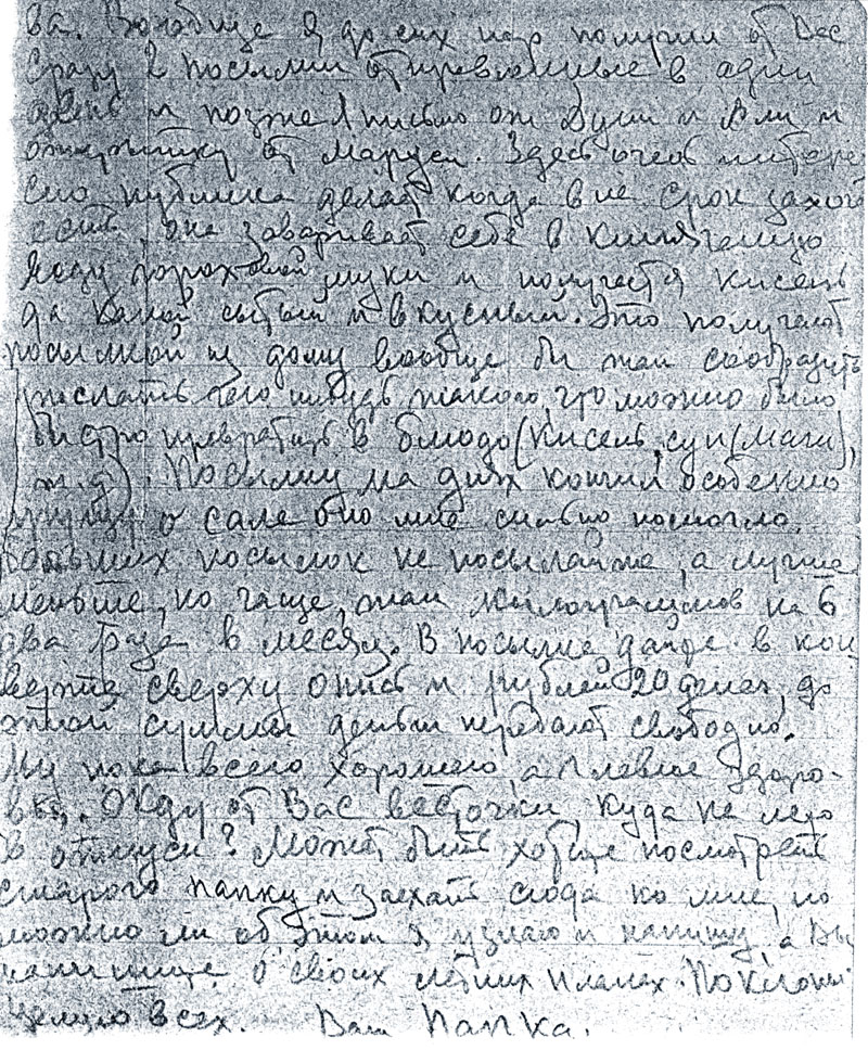 Милые Дуня и ребята! Адрес мой Кировская область, Вятлаг, 4-ое отделение. Работаю на заготовке леса. Пошлите мне срочно: 1) 30 р. денег. 2) Кошелку, подушку, одеяло (теплое, старое), куль, носки, сала нутряного свиного, миску в 1½ литра, ложку алюминиевую, кружку в ½ литра, 2 кило сахара, сухарей, ниток потолще, 2 иголки, чаю, очки для дальнозоркого (правый 3, левый 1½), карандаш, бумагу (записн. книжку), столбовский пиджак, книгу о лекарств. растениях. Скоро пошлю письмом доверенности на зарплату. Поклоны. Всех целую. Папа.