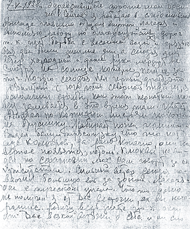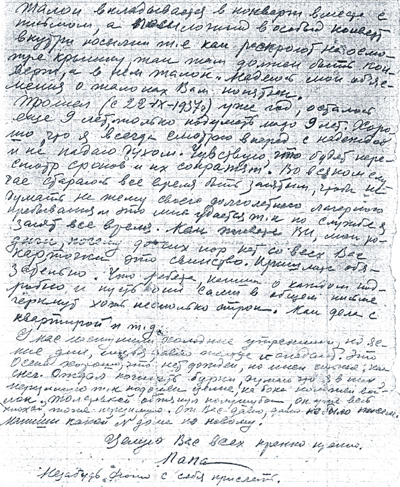 Прошел (с 22-IX-1937 г.) уже год, осталось еще 9 лет, только подумать надо: 9 лет. Хорошо, что я всегда смотрю вперед с надеждой и не падаю духом. Чувствую, что будет пересмотр сроков, и их сократят. Во всяком случае, стараюсь все время быть занятым, чтобы не думать на тему своего долголетнего лагерного пребывания и это мне удается, т.к. по службе я занят все время.