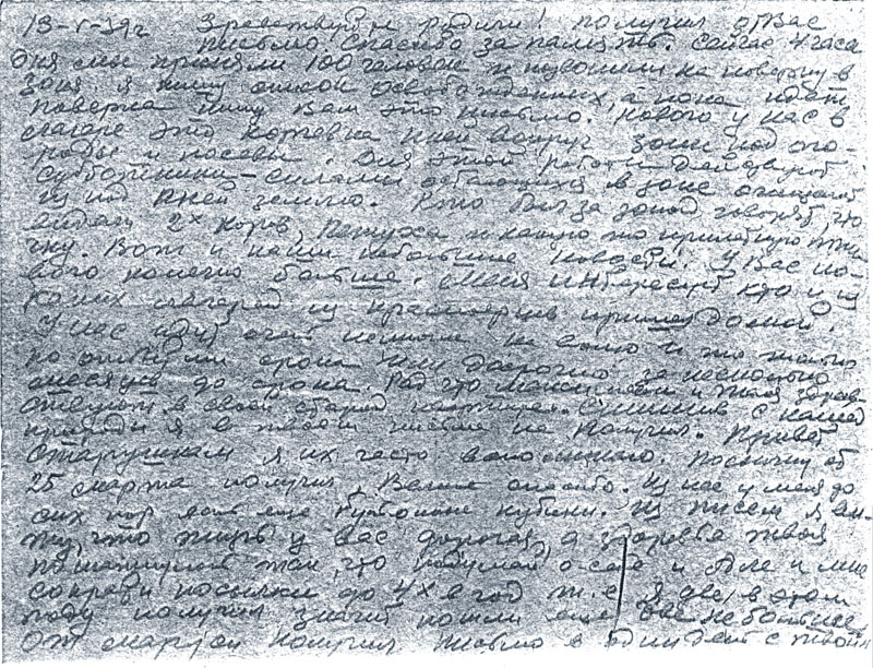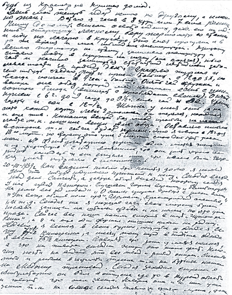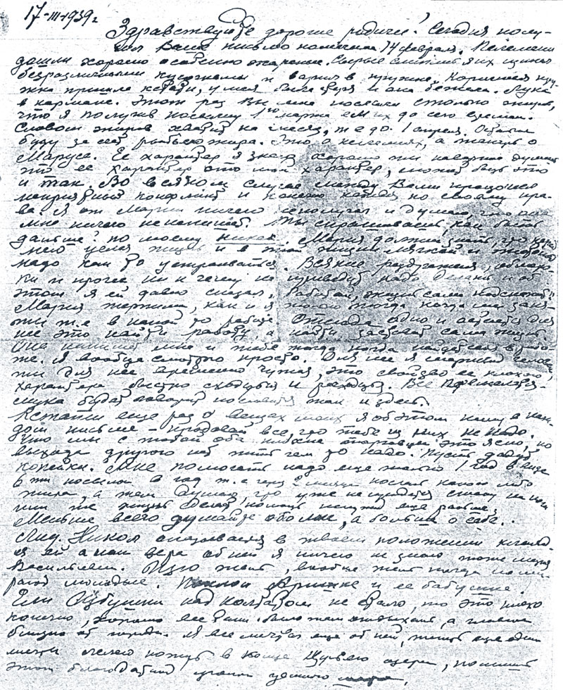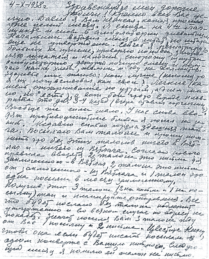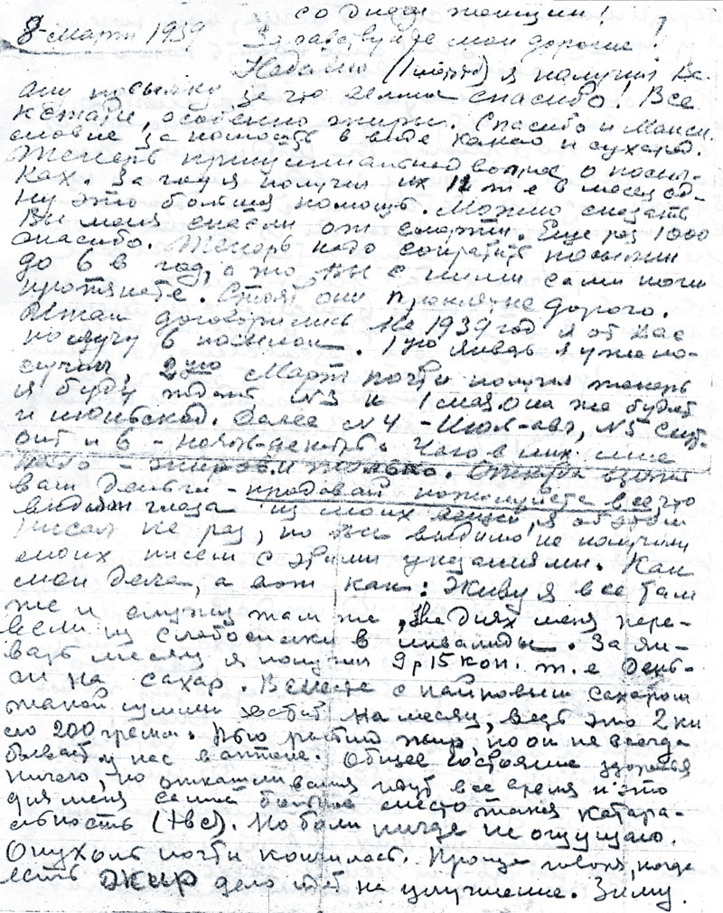 Недавно (1 марта) я получил Вашу посылку, за что великое спасибо! Все кстати, особенно жиры. Спасибо и Максимовне за помощь в виде какао и сухарей. Теперь принципиальный вопрос о посылках. За год я получил их 12, т.е. в месяц одну, это большая помощь. Можно сказать, Вы меня спасли от смерти. Еще раз 1000 спасибо. Теперь надо сократить посылки до 6 в год, а то Вы с ними сами ноги протянете. Стоят они, проклятые, дорого. Итак, договорились. На 1939 год я от Вас получу 6 посылок. 1-ую январь я уже получил, 2-ую март почти получил, теперь я буду ждать № 3 к 1 мая. Она же будет и июньской. Далее № 4 – июль-авг., № 5 сент.-окт. и 6 – ноябрь-декабрь. Чего в них мне надо – жиров и только. Откуда взять вам деньги – продавай, пожалуйста, все, что видят глаза из моих вещей, я об этом писал не раз, но Вы, видимо, не получили моих писем с этими указаниями.