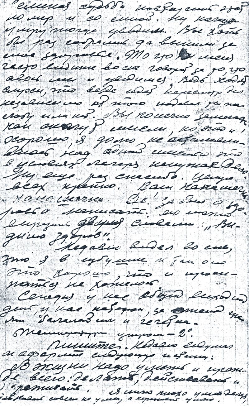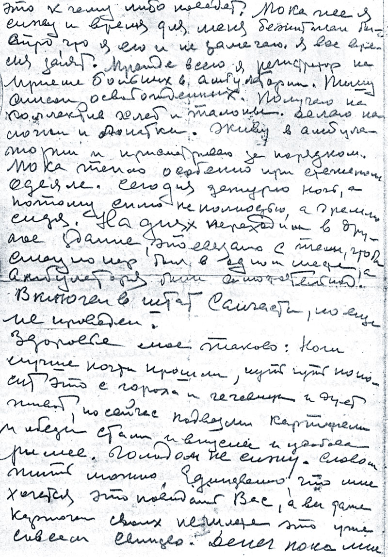 Здравствуйте, мои дорогие родичи! Крепко всех Вас целую. Давно я Вам не писал, кажется, прошел уже целый месяц. Я снова на 4-м лагпункте и снова в амбулатории дневным. Начальник вставил меня в штаб, но штаты еще не утверждены. Сейчас я регистрирую то больных на приеме, заготовляю шпателя и палочки, сторожу изнутри амбулаторию, дежурю ночную смену и получаю пайку хлеба, жалобы и еду на коллектив.