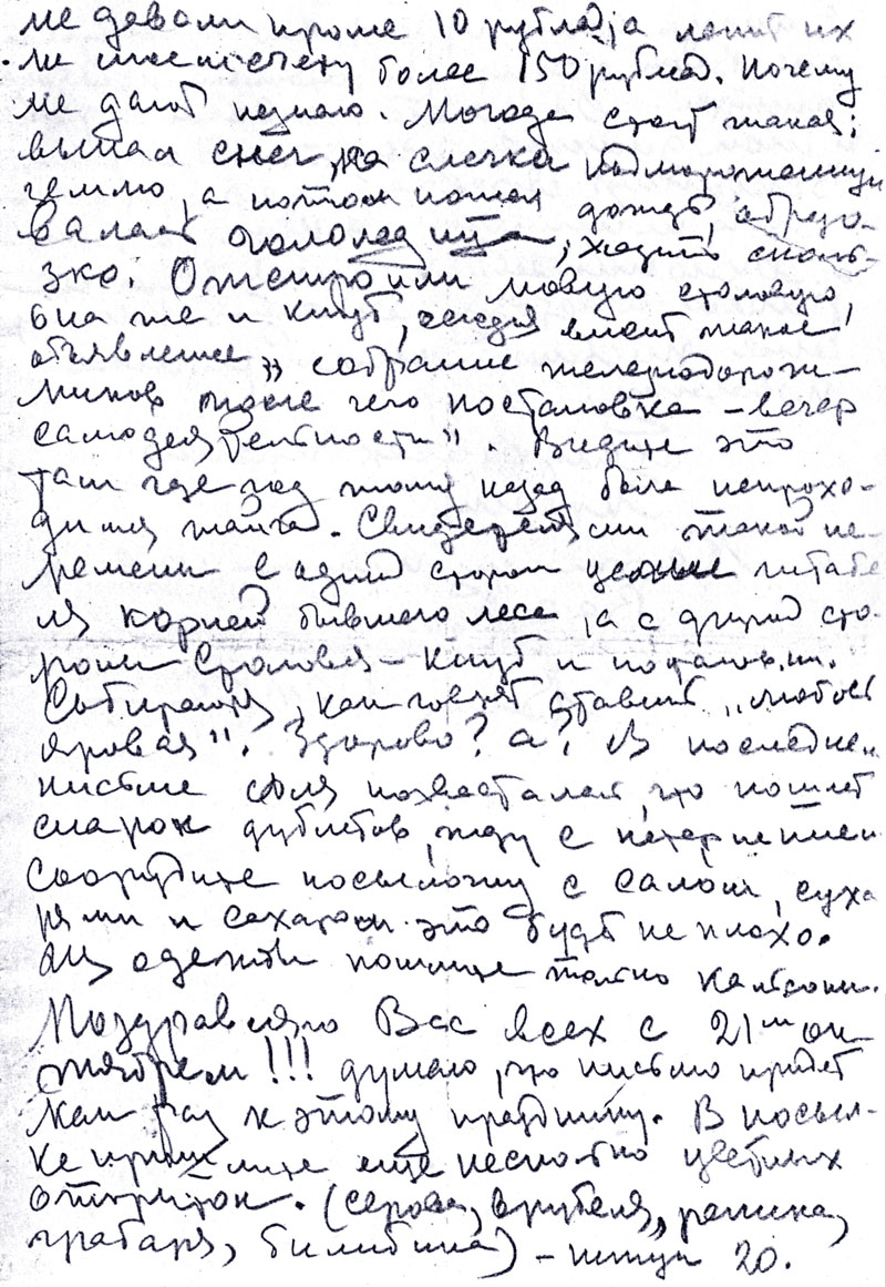 Поздравляю с 1-м мая! Май мы здесь ознаменовали как выходной день, прежде всего долгим сном. Проснулись часов в 10 утра. Затем лично у меня чай с пряниками из ларька. А еще дальше воспоминания мая в прошлом. Вообще, мы как пожизненные зека живем только во сне или в мечтах. Лично у меня масса воспоминаний, и я умею мечтать также как умею и работать, а вот когда я смотрю на других, то вижу, что они не знают как и чем себя занять, кто ходит и шумит, а кто переживает молча. Рядом гудит патефон, затем струнный оркестр. В общем, приоделись на май, особенно женщины, у многих появились блестящие юбки, а некоторые ходят сейчас на вечер. Я починил одни штаны другими и хожу без дыр, т.е. тоже прилично. Сегодня в клубе что-то вроде постановки, но я буду сидеть дома, и когда все уйдут, я буду чертить всякие ботанические схемы. Один термометр сломался, и я пропустил 6 дней, теперь наблюдаю по новому термометру. Снега в зоне и за зоной уже нет, говорят, и в лесу мало осталось. Никого нового у нас на праздник не приезжало, все те же люди. У нас в лагере все получают письма о том, что многие из лагерей пришли по домам, напишите мне об этом, очень интересно (о Нулло и зав. баней я знаю от Али). Хотел бы поклониться Арсену, если ему кто будет писать, его Петровне от меня и Наде с Маргаритой общий привет. Цингитные конфеты съел. Подушку и наволочку не посылайте, сплю на чьей-то. Какие цены на продукты, говорят дорогие, напишите.