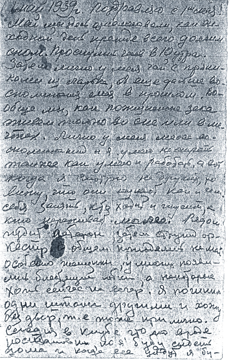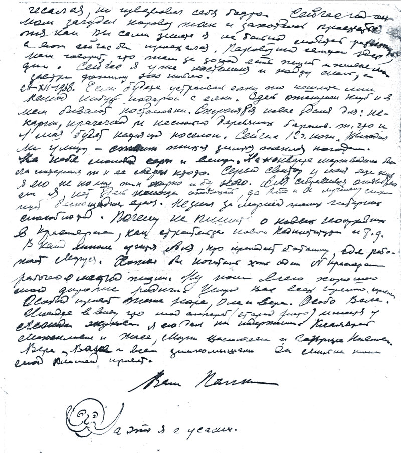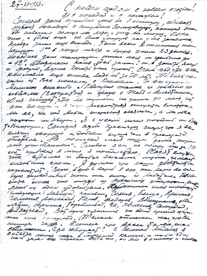 28-XII-1938. Если будете устраивать елку, то пошлите мне какой-нибудь подарок с елки. Здесь отстроен клуб и в нем бывают постановки. Строятся новые здания для: пекарни, прачечной и несколько деревянных бараков, т.к. что к 1 мая будет настоящий поселок. Сейчас 12 ч. ночи. Выходил на улицу – стоит тихая зимняя погода. На небе молодой серп и венцы. На конверте марка, видимо, была интересная, т.к. ее содрал кто-то. Серый свитер у меня еще жив, я его не ношу, т.к. жарко и без него. Аля спрашивает как я отдыхаю, нет здесь времени отдыхать, да это и к лучшему, идет беспощадное время. Не знал за Марией таких гитарных способностей. Прочему не пишите о новых стройках в Красноярске, как стройка нового пединститута и т.д. Как учится Аня, кто преподает ботанику, где работает Маруся. Хотел бы почитать хоть один № «Красноярского рабочего» о местной жизни. Ну, пока, всего хорошего, мои дорогие родичи. Целую Вас всех крепко, крепко.