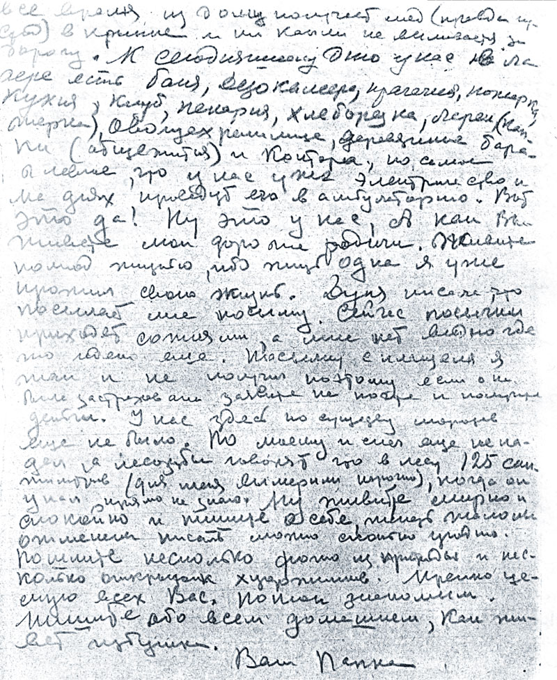 К сегодняшнему дню у нас в лагере есть баня, дезокамера, прачечная, пожарка, кухня, клуб, пекарня, хлеборезка, ларек (каптерка), овощехранилище, деревянные бараки (общежития) и контора, но самое главное что у нас уже электричество и на днях проведут его в амбулаторию. Вот это да! Ну, это у нас, а как Вы живет, мои дорогие родичи. Живите полной жизнью, ибо жизнь одна, я уже прожил свою жизнь. Дуня писала, что посылает мне посылку. Сейчас посылки приходят сотнями, а мне нет, видно где-то идет еще. Посылку с плащом я так и не получил, поэтому если она была застрахована, заявите на почте и получите деньги.