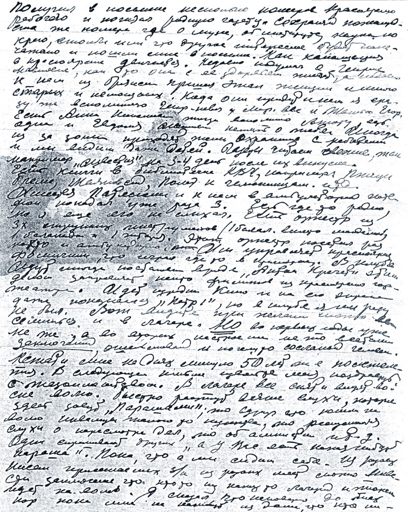 Газеты читаем свежие, так, например, «Известия» на 3-4 день после выпуска. Есть книги в библиотеке КВЧ, например, «Птицы» Брема, Маяковский, «Полет к челюскинцам». Есть где-то радио, но я его еще не слыхал. Есть оркестр из 3-х струнных инструментов (1 балал. вместо мандолины, 1 балалайка и 1 гитара). Этот оркестр посетил раз амбулаторию. Им управляет красноярец Фомичин, что играл где-то в Красноярске. В клубе идут иногда постановки вроде «Антон Кречет», этим делом заправляет некто Филипов из Красноярского гортеатра. Идет изредка кино, и на его экране даже показывался «Петр I», но в клубе я ни разу не был. Вот видите, при желании можно веселиться и в лагере. Но, во-первых, годы уже не те, а во-вторых, настроение не то вследствие заключений. Кстати, мне на днях минуло 50 лет, т.е. полстолетия. В лагере все спят и видят волю. Быстро растут всякие слухи, которые здесь зовут «парашютами», то вдруг что пошли на волю инвалиды, то распространятся слухи о пересмотре дел, то об амнистии и т.д. Пока что мы сидим себе. Из разных писем, присылаемых з/к из разных мест можно вывести заключение, что кто-то из каких-то лагерей идет на волю. Я сказал, что не поверю до тех пор, пока сами не напишут из дома, что кто-нибудь из Красноярска пришел домой.