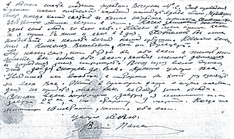 Ну, написал как будто бы обо всем, а теперь пишите вы мне обо всем, каждая мелочь домашняя и городская меня интересует. Пишу через волю, думаю, что дойдет скорее до Вас. Крепко целую Вас. Увидимся ли вообще, а интересно бы хоть раз взглянуть на всех Вас. Жить в Красноярске даже в случае освобождения не придется, так как не дадут злые люди. Итак, всего хорошего, завтра я именинник, так как завтра 22-ое, а по-старому 9 марта. Когда же именинница Алевтина, напишите обо всем.