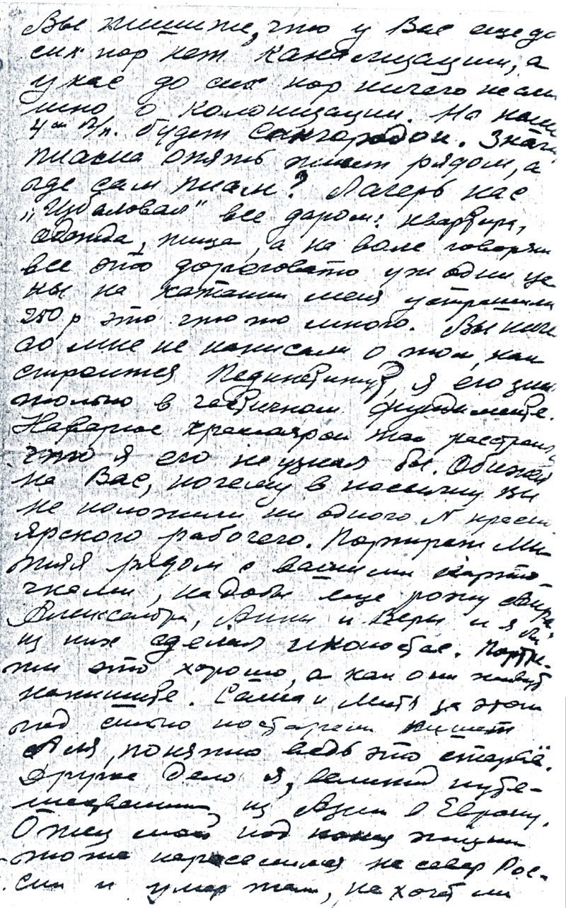 Как живете Вы, мои родичи, почему до сих пор нет со всех Вас карточки, это свинство. Пришлите обязательно. Что ребята (Прим. ред. сайта: столбисты), напиши о каждом подробно и пусть они сами в общем письме черкнут хоть несколько строк. Как дела с квартирой и т.д.
