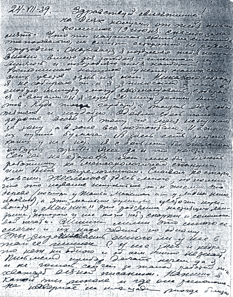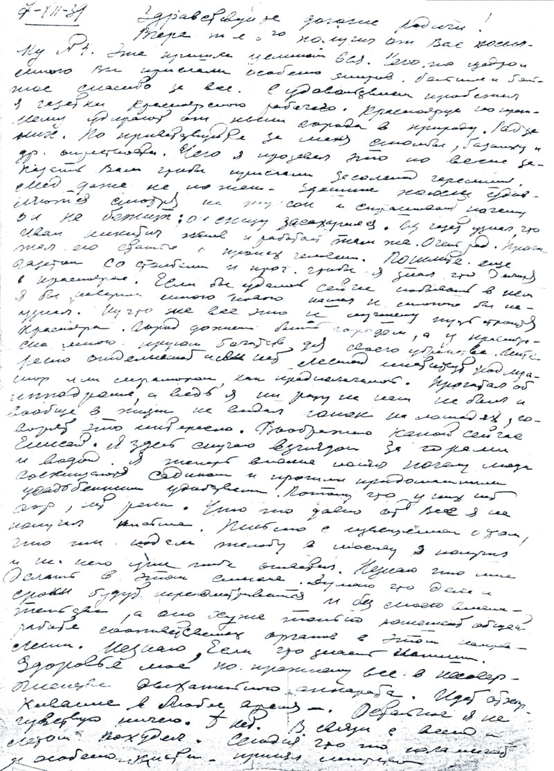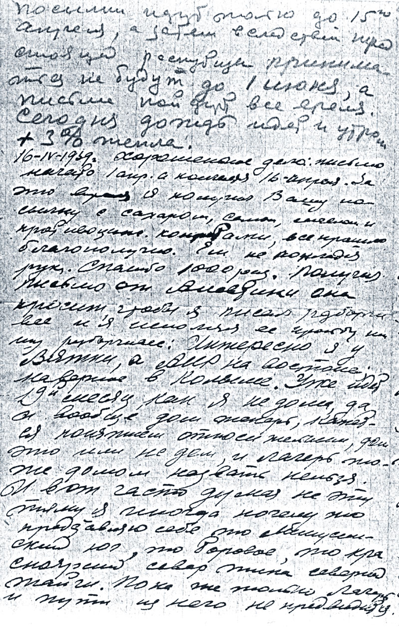 11-YII-39 г. Только сегодня я смог из-за всяких дел спустить тебе это письмо. Сейчас на пункт привезли зеленого лука, едим и наслаждаемся свежестью этой зелени. Сегодня коллективно кончили присланный мед, мечтаю в будущем иметь мед собственной пасеки. Сейчас у нас за зоной целое поле белых белоголовников на местах выруба и много кувшинок, видимо, здесь можно бы было водить пчел. Сегодня праздник, т.е. выходной день и в зоне идет ощая уборка мусора и пр.