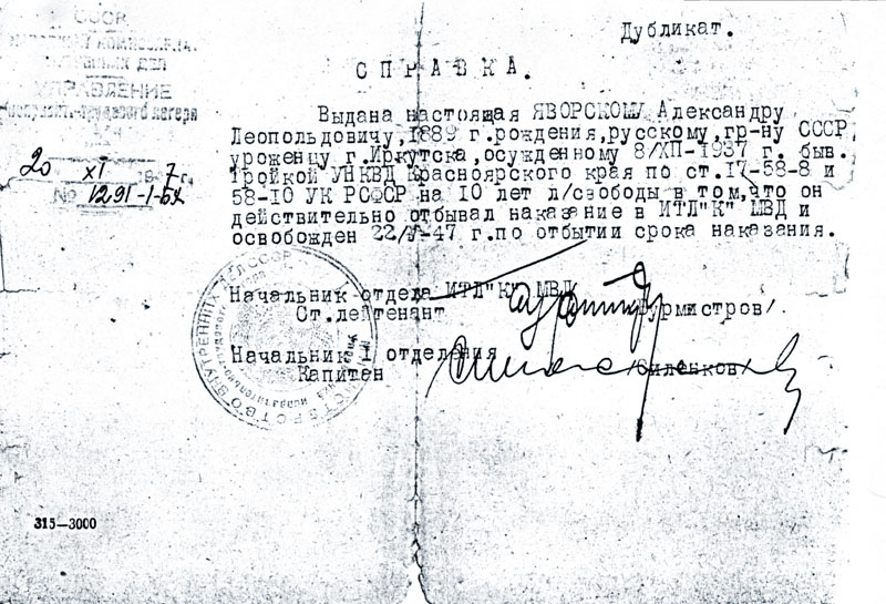 Выдана настоящая ЯВОРСКОМУ Александру Леопольдовичу, 1889 г. рождения, русскому, гр-ну СССР, уроженцу г.Иркутска, осужденному 8/XII-1937 г. быв. Тройкой УНКВД Красноярского края по ст.17-58-8 и 58-10 УК РСФСР на 10 лет л/свободы в том, что он действительно отбывал наказание в ИТЛ «К» МВД и освобожден 22/Y-47 г. по отбытии срока наказания.
