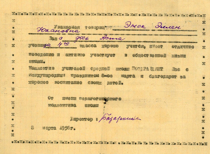 В 1952 году пошли и мы в школу, там уже учились только на русском. В первом классе у нас с подружками возникла проблема - нас трое, а за одной партой могут сидеть только двое. Точно не помню, но, по-моему, нас в течение учебного года не раз пересаживали, во втором классе проблема разрешилась, поступила новая ученица Эмма Мильдер, с которой мы быстро подружились и нас стало две пары. Дома мы разговаривали на эстонском, мамы учили нас читать и писать на родном языке.