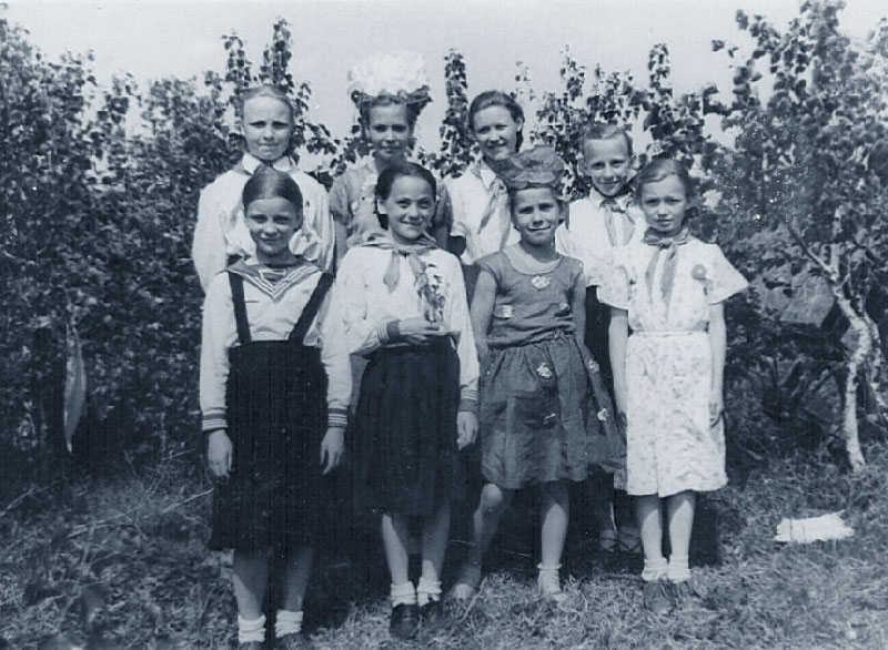 Очень интересна была пионерская пора, у нас были разные кружки: самодеятельности, тимуровский, фотографии и т.д. Я была активным ребенком, в пионерской дружине прошла все этапы иерархии: была председателем Совета отряда, знаменоносцем дружины и в последние две четверти моего пребывания в Сибири- председателем Совета дружины. Пионервожатой была выпускница нашей Балахтинской средней школы № 43 Валя Толстикова, она была очень молода и активна, поэтому отлично понимала нас. С нею мы были постоянно чем- то заняты. Особенно запомнилась поездка на районный фестиваль художественной самодеятельности. Для поездки в Балахту нам из совхоза дали телегу с лошадью, и мы поехали не по большой дороге, а по нижней -вдоль реки. Ехали так медленно, что к нашему прибытию все участники уже закончили выступления, мы были очень огорчены, ведь готовились к этому смотру всю зиму, сами сшили себе костюмы. По просьбе Вали нам все -таки разрешили вне конкурса исполнить танец "Молдовеняска". Несмотря на неудачу в конкурсе, своей поездкой в Балахту мы остались очень довольны, ведь это был первый самостоятельный выезд из дома! Ночевали в спортивном зале какой-то Балахтинской школы, впервые увидели речные суда, ведь у нас в зерносовхозе, Чулым не был судоходным, восхищались двухэтажными домами - таким у нас был только клуб.
