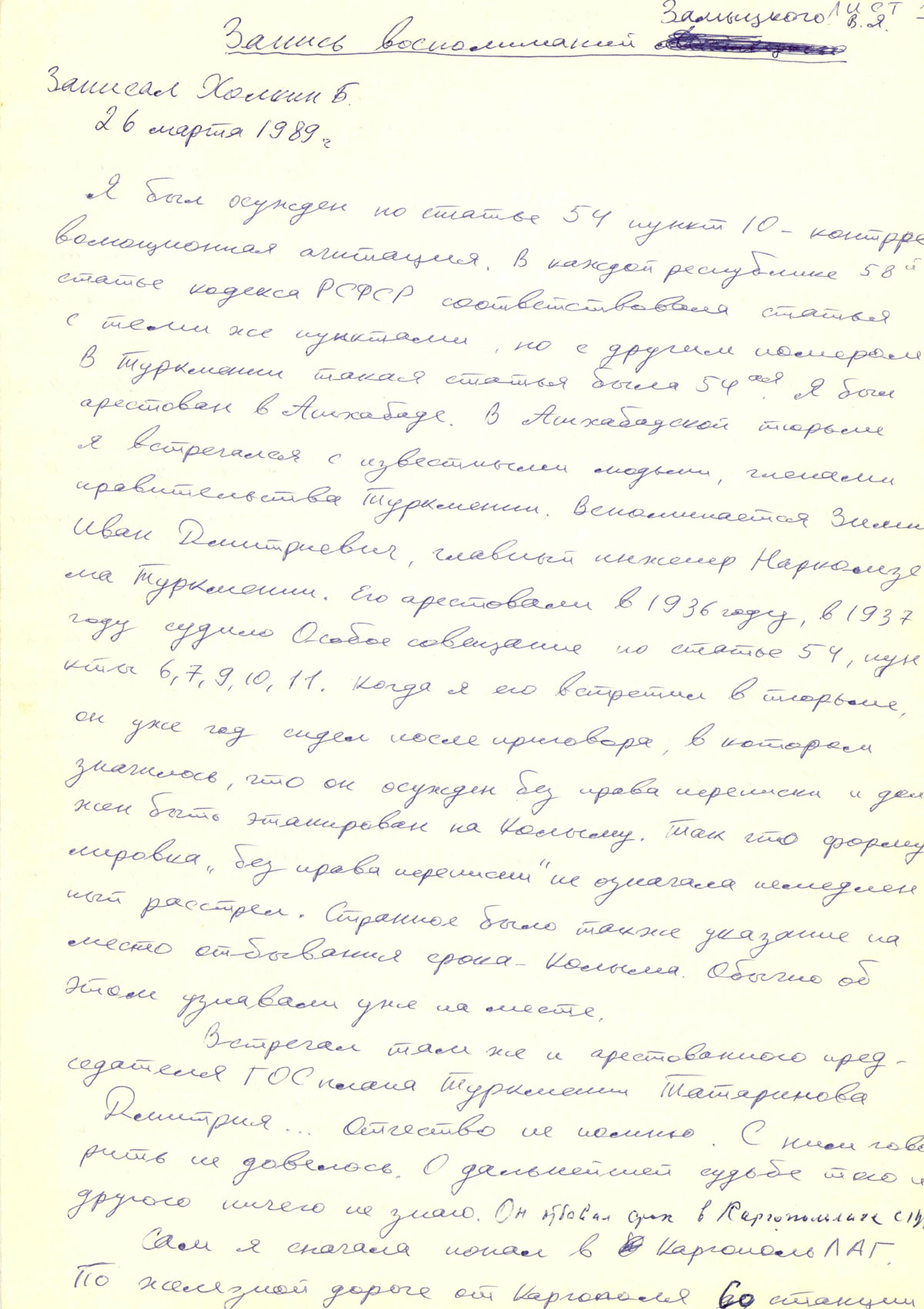 Я был осужден по статье 54 пункт 10 - контрреволюционная агитация. В каждой республике 58-й статье кодекса РСФСР соответствовала статья с теми же пунктами, но с другим номером. В Туркмении такая статья была 54-ая. Я был арестован в Ашхабаде. В Ашхабадской тюрьме я встречался с известными людьми, членами правительства Туркмении. Вспоминается Зимн(?) Иван Дмитриевич, главный инженер Наркомзема Туркмении. Его арестовали в 1936 году, в 1937 году судило Особое совещание по статье 54, пункты 6,7,9,10,11. Когда я его встретил в тюрьме, он уже год сидел после приговора, в котором значилось, что он осужден без права переписки и должен быть этапирован на Колыму. Так что формулировка “без права переписки” не означала немедленный расстрел. Странное также было указание на место отбывание срока - Колыма. Обычно об этом узнавали уже на месте.