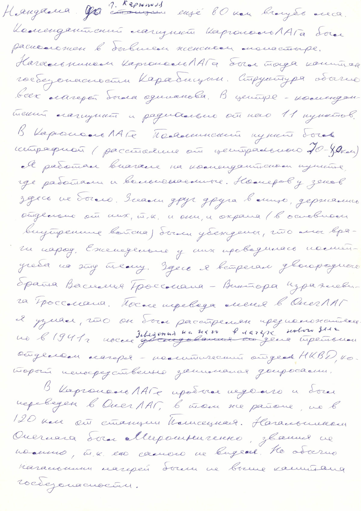 В Каргопольлаге Пояминский пункт был штрафной (расстояние от центрального 70-80 км). Я работал вначале на комендантском пункте, где работали и вольнонаемные. Номеров у зеков здесь не было. Знали друг друга в лицо, держались отдельно от них, т. к. и они, и охрана( в основном внутренние войска) были убеждены, что мы враги народа. Еженедельно у них проводилась политучеба на эту тему. Здесь я встречал двоюродного брата Василия Гроссмана - Виктора Израэльевича Гроссмана. После перевода меня в Онеглаг я узнал, что он был расстрелян предположительно в 1941 г. после заведения на него в лагере нового дела третьим отделом лагеря - политическим отделом НКВД, который непосредственно занимался допросами.