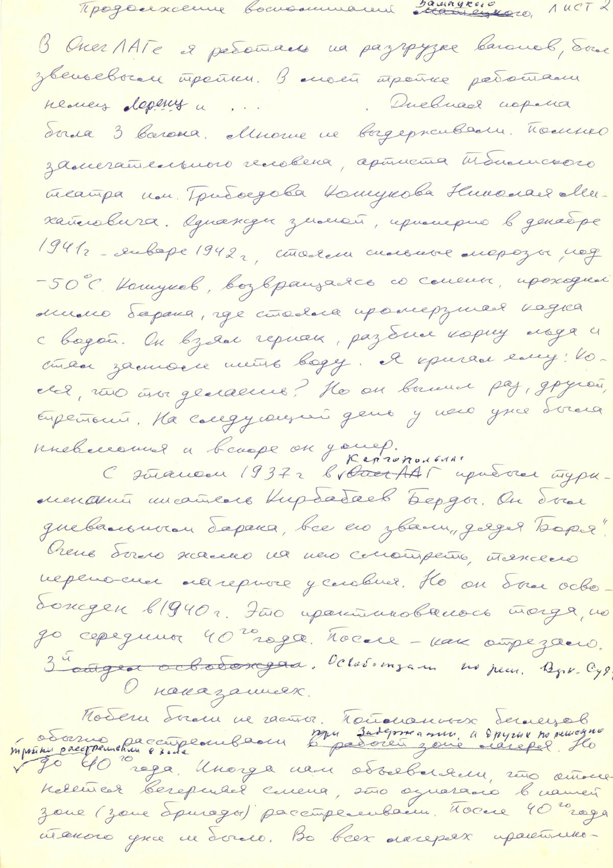 В Онеглаге я работал на разгрузке вагонов, был звеньевым тройки. В моей тройке работали немец Лоренц и….. (пропущено). Дневная норма была 3 вагона. Многие не выдерживали. Помню замечательного человека артиста Тбилисского театра им. Грибоедова Кожухова Николая Михайловича. Однажды зимой, примерно в декабре 1941 г. - январе 1942 г., стояли сильные морозы под -50. Кожухов, возвращаясь со смены, проходил мимо барака, где стояла промерзлая кадка с водой. Он взял черпок, разбил корку льда и стал залпом пить воду. Я кричал ему: “Коля, ты что делаешь?” Но он выпил раз, другой, третий. На следующий день у него уже была пневмония и вскоре он умер.