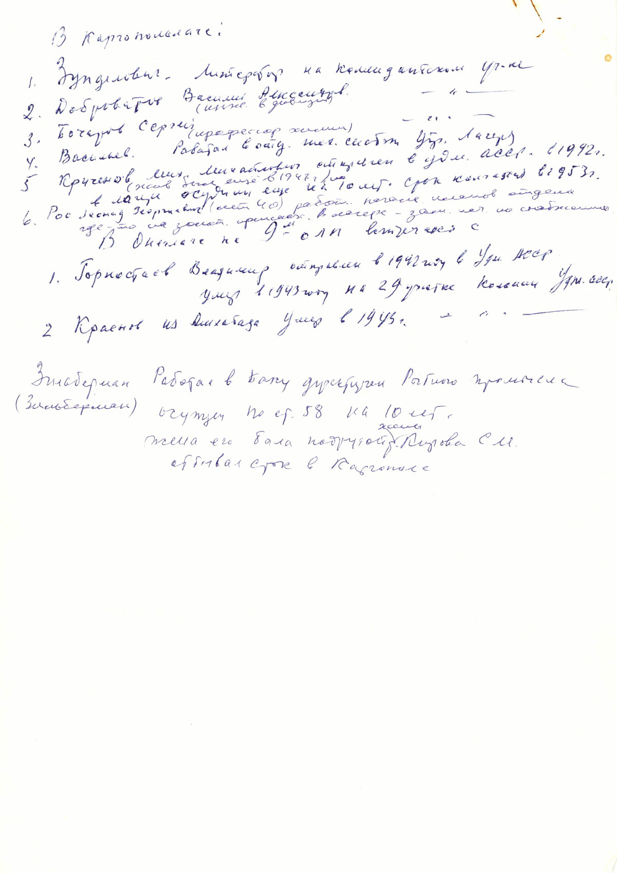 Встречал там же и арестованного председателя ГОСплана Туркмении Татаринова Дмитрия. Отчество не помню. С ним говорить не довелось. О дальнейшей судьбе того и другого ничего не знаю. (Пометка - Он отбывал срок в Каргопольлаге с/у)