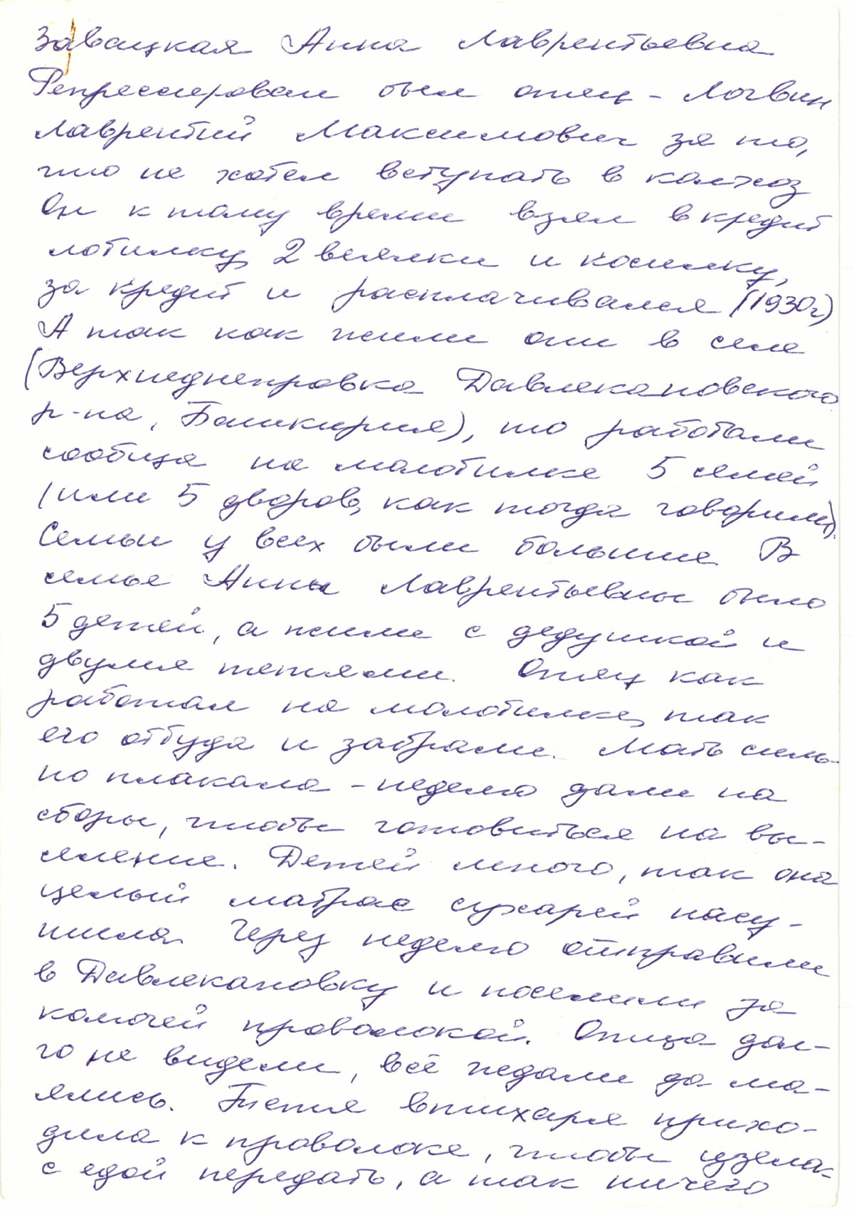 Семьи у всех были большие. В семье Анны Лаврентьевны было 5 детей, а жили с дедушкой и двумя тетями. Отец как работал на молотилке, так его оттуда и забрали. Мать сильно плакала - неделю дали на сборы, чтобы готовиться на выселение. Детей много, так она целый матрас сухарей насушила. Через неделю отправили в Давлекановку и поселили за колючей проволокой. Отца долго не видели, все ждали да маялись. Тетя втихаря приходила к проволоке, чтобы узелок с едой передать, а так ничего передавать не разрешали. Придумали тогда, как курицу передать: вырыли ямку под проволокой, она туда курицу и положит, а потом уже ее потихоньку достанут маленькая Аня с сестрами. Голодно было.