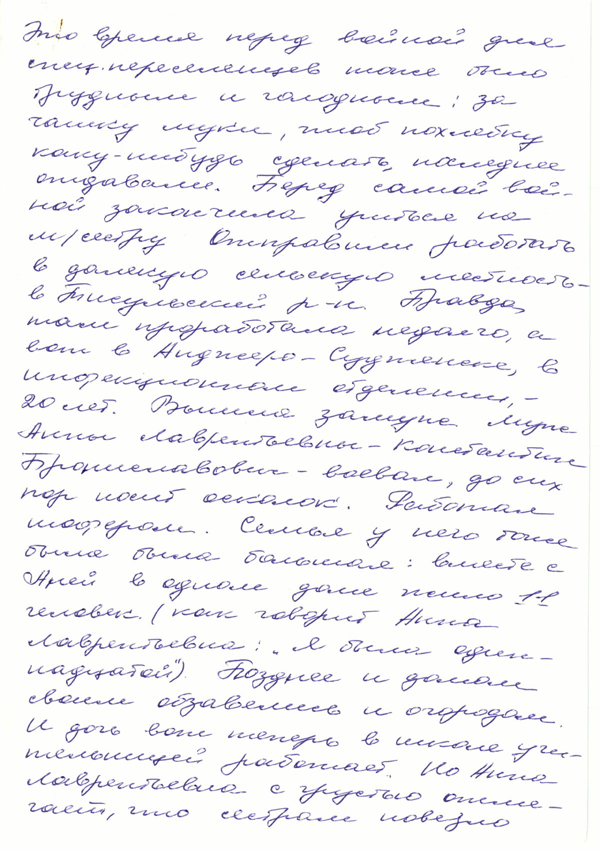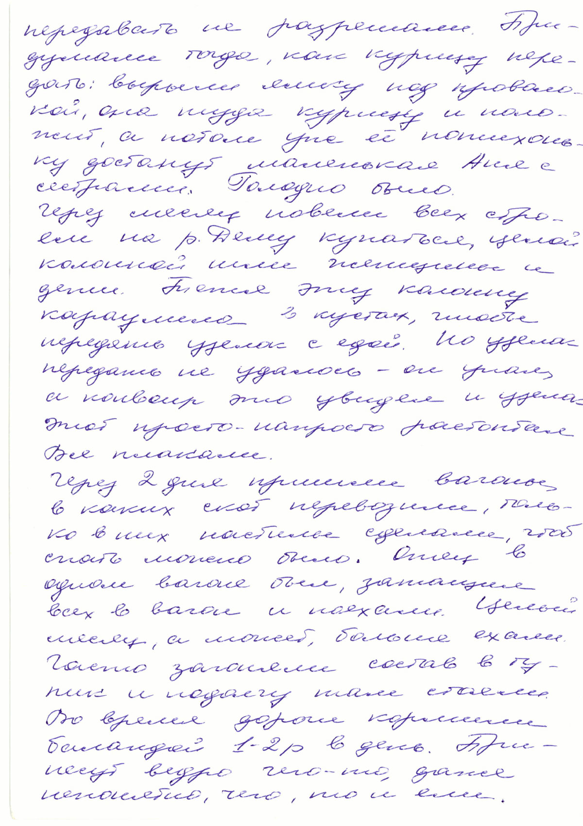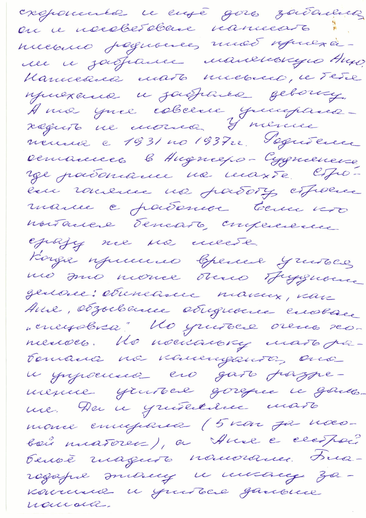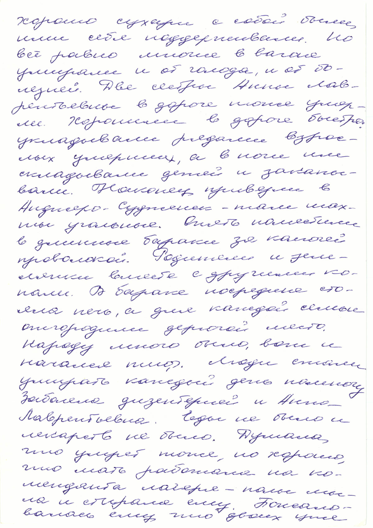 Через два дня пришли вагоны в каких скот перевозили, только в них настилы сделали, чтоб спать можно было. Отец в одном вагоне был, затащил всех в вагон и поехали. Целый месяц, а может больше ехали. Часто загоняли состав в тупик и подолгу там стояли. Во время дороги кормили баландой 1-2 раза в день. Принесут ведро что-то даже непонятно чего, то и ели. Хорошо сухари с собой были, ими себя поддерживали. Но все равно многие в вагоне умирали и от голода, и от болезней. Две сестры Анны Лаврентьевны в дороге тоже умерли. Хоронили в дороге быстро: укладывали рядами взрослых умерших, а в ноги им складывали детей и закапывали. Наконец привезли в Анджеро-Судженск - там шахты угольные. Опять поместили в длинные бараки за колючей проволокой. Родители и земляки вместе с другими копали. В бараке посредине стояла печь, а для каждой семьи отгородили дерюгой место. Народу много было, вот и начался тиф. Люди стали умирать каждый день помногу. Заболела дизентерией и Анна Лаврентьевна. Еды не было и лекарств не было. Думала, что умрет тоже, но хорошо, что мать работала на коменданта лагеря - полы мыла и стирала ему. Пожаловалась ему, что двоих уже схоронила и еще дочь заболела, он и посоветовал написать письмо родным, чтоб приехали и забрали маленькую Аню. Написала мать письмо, и тетя приехала и забрала девочку. А та уже совсем умирала, ходить не могла. У тети жила с 1931 по 1937 гг. Родители остались в Анджеро-Судженске, где работали на шахте. Строем гоняли на работу, строем гнали с работы. Если кто-то пытался бежать, стреляли сразу же на месте. Когда пришло время учиться, то это тоже было трудным делом: обижали таких, как Аня, обзывали обидным словом “спецовка”. Но учиться очень хотелось. Но поскольку мать работала на коменданта, она и упросила его дать разрешение учиться дочери и дальше. Да и учителям мать тоже стирала (5 коп за носовой платочек), а Аня с сестрой белье гладить помогали. Благодаря этому и школу закончила, и учиться дальше пошла.