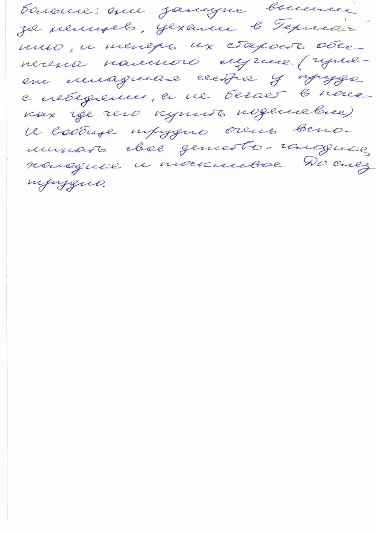 Вышла замуж. Муж Анны Лаврентьевны - Константин Брониславович - воевал, до сих пор носит осколок. Работал шофером. Семья у него тоже была большая: вместе с Аней в одном доме жило 11 человек. Как говорит Анна Лаврентьевна: “Я была одиннадцатой.” Позднее и домом своим обзавелись, и огородом. И дочь вот теперь в школе учительницей работает. Но Анна Лаврентьевна с грустью отмечает, что сестрам повезло больше: они замуж вышли за немцев, уехали в Германию, и теперь их старость обеспечена намного лучше (гуляет младшая сестрау озера с лебедями, а не бегает в поисках где чего купить подешевле). И вообще трудно очень вспоминать свое детство - голодное, холодное и тоскливое. До слез трудно.