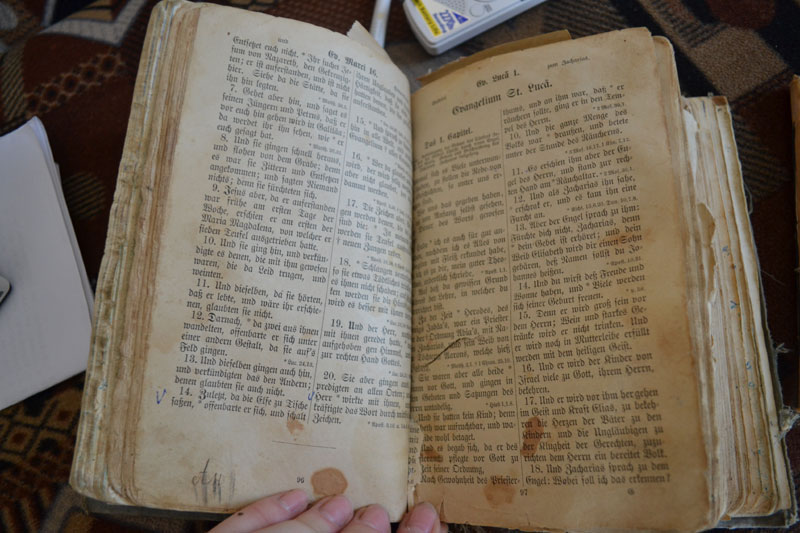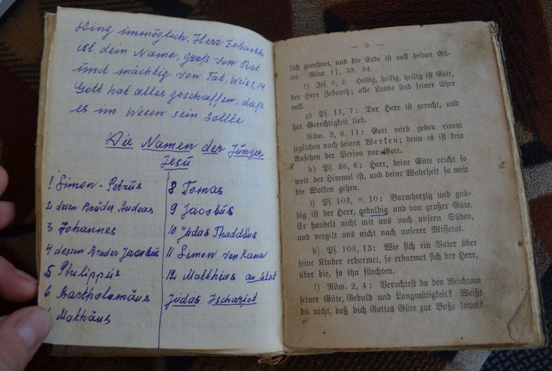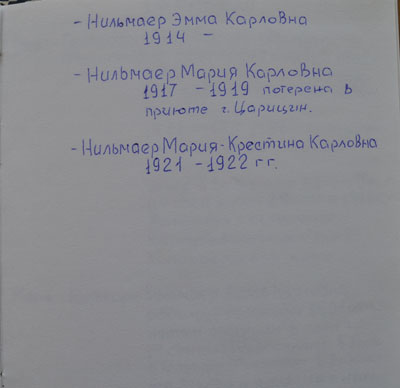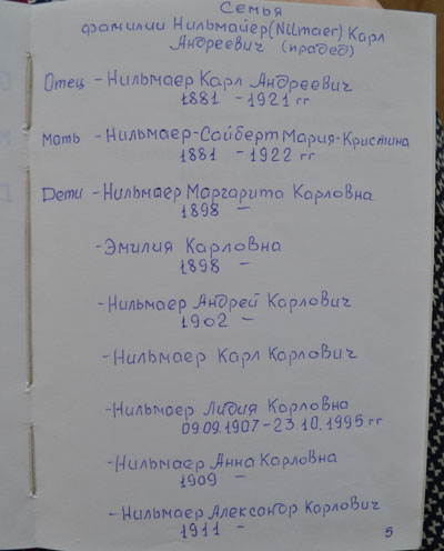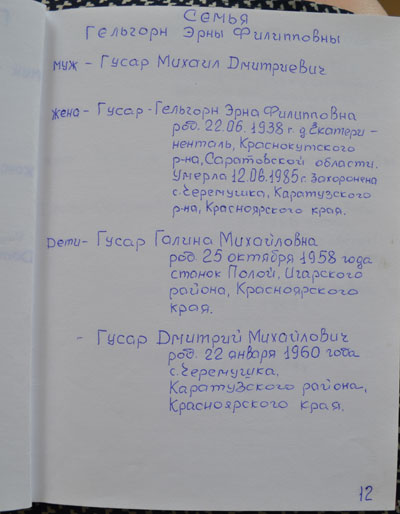 Всей семьей около месяца «лежали» в г. Канск. Вагоны была заполнены военной техникой для фронта, а людей распределили по палаткам. Раз в день кормили супом, давали хлеб. Среди людей были разные народы, не только немцы: латыши, финны, греки.