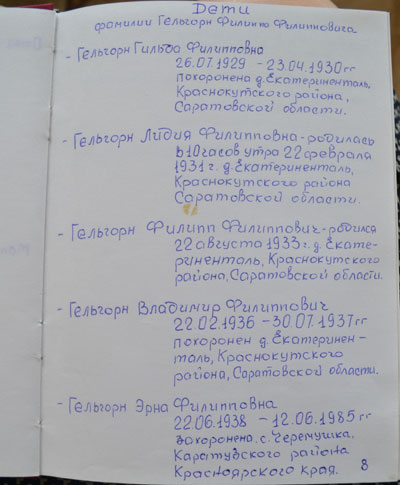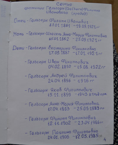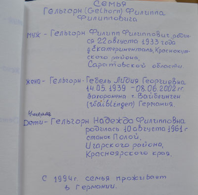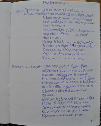 Отец – Гельгорн Филипп Филиппович (1902 г.р.), мать – Гельгорн (Нильмаер) Лидия Карловна (1907 г.р.), выросли шесть детей: Лидия, Филипп, Владимир, Эрна, Андрей, Эрна; двое умерли маленькими: Гильда/Нина, Владимир (подробнее о составе семьи можно посмотреть страницы из «Фамильной книги», фото). Отец работал бухгалтером, заканчивал специальные курсы. Мать умела читать и писать. Родители хорошо говорили по-русски. Семья жила в г. Екатерининталь (Краснокутский р-н, Саратовская обл.).