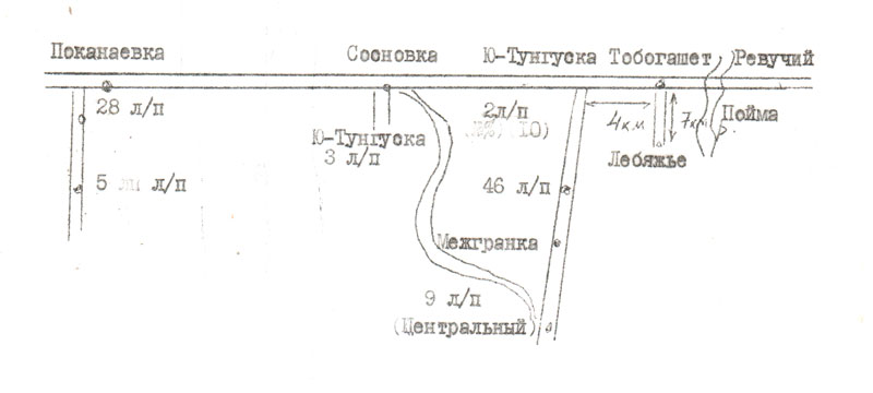 Заключенными была построена железная дорога от Ревучего, л/п на Лебяжьем назывался Озерки, численность 500-600 человек. В Ю-Тунгуске было 2 лагеря, 1-500чел. лесозаготовки, 2-800 чел. с/х работы в основном женщины. Сосновка 600-700 чел. В каждом лагпункте ежедневно хоронила 2-3 человека. Ежегодно количество заключенных практически обновлялось. В основном было истощение, пеллагра. Не доезжая Сосновки 8-9 км, где-то на 36-37 километре находился лагерь полностью из землянок.