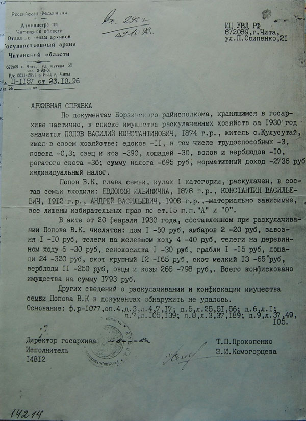 В семье деда, на границе с Китаем были пограничники, они семье Поповых столовались и один из этих военных встретил на Колыме Попова Андрея Васильевича и дядю, и этот военный помог Андрею Васильевичу раньше освободиться. Он приехал после лагеря к родителям в Мотыгинский район и там прожил всю жизнь. А деда - Попова Константина Николаевича забрали, и он исчез бесследно. Жена его и ее брат жили в Пировске Мотыгинского района, потом Николая забрали на фронт. Из семьи Поповых взяли Сергея Попова ( погиб на фронте).
