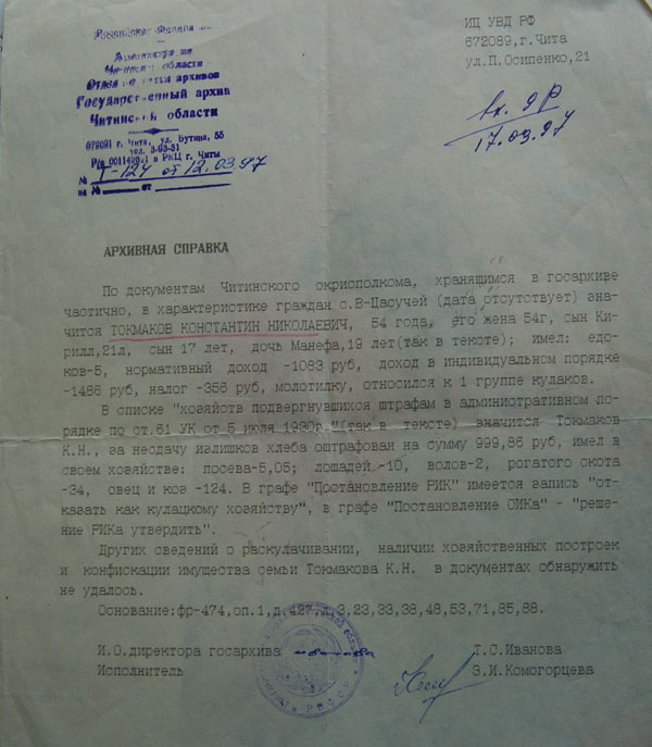 Токмакова Константина Николаевича (деда) забрали и увезли в Казахстан, там расстреляли. Брата Андрея Васильевича - Попова Илью Васильевича забрали вперед, а уже потом, 15.02.1930 отца Галины Андреевны арестовали и 27.08.1930 постановлением тройки ОГПУ ДВК осудили на 10 лет по ст. 58-10 (реабилитирован 16.11.89). Попову Андрею Васильевичу на то время было приблизительно 20-22 года.
