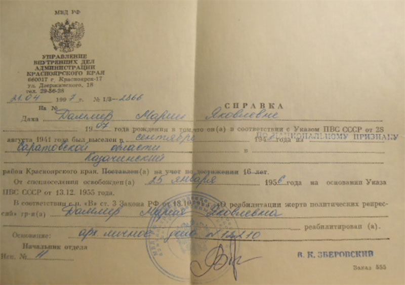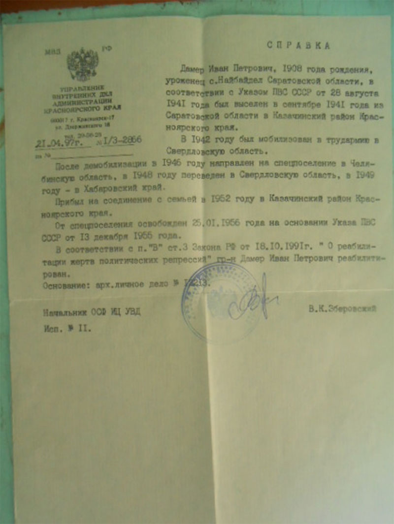 Другая сестра была депортирована на Алтай, позже она, вместе со своей семьей, приезжала к нам в гости и связь с ними мы поддерживали, пока мама была жива. Бабушка Клары Ивановны по маминой линии умерла еще до войны, а отец жил в другом селе, откуда его также депортировали. Его поместили не в тот вагон, в котором ехала семью Даммер, поэтому и отправили в другое место. О его дальнейшей судьбе ничего не известно.