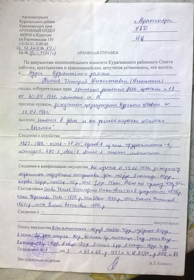 сельсовета Курагинского р-на ЗСК. Раскулачен, лишен политических прав, выслан в