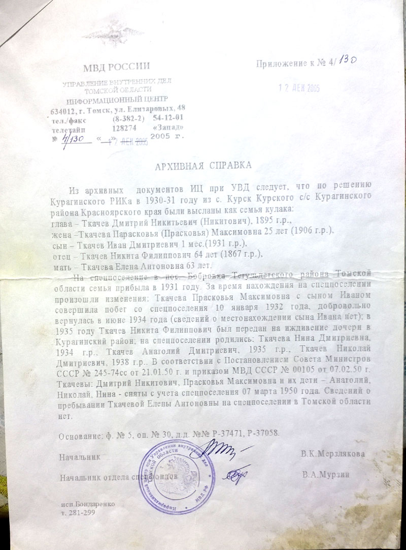 1931 в Томскую обл. с семьей: жена Прасковья Павловна (Максимовна), 1897 (1906)