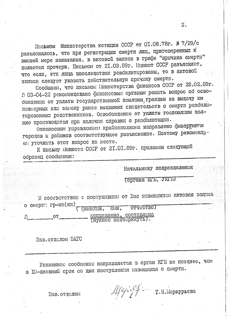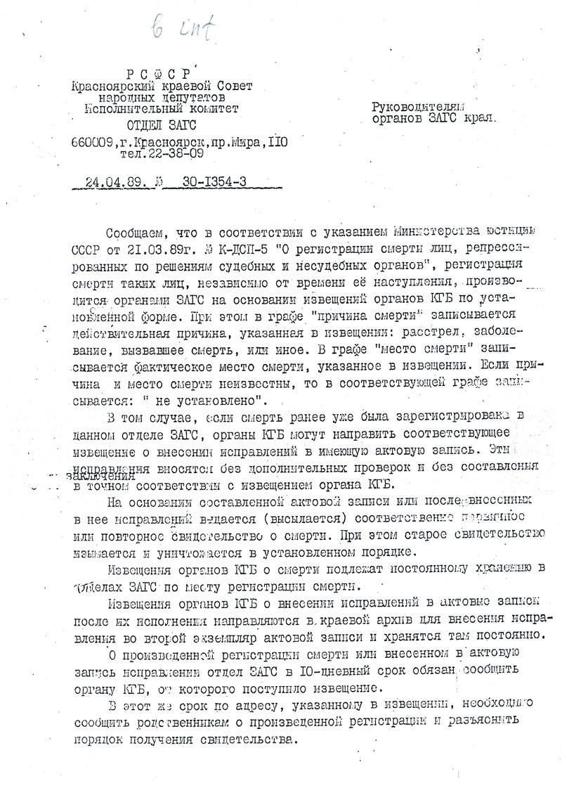 Сообщаем, что в соответствии с указанием Министерства юстиции СССР от 21.03.89г. К-ДСП-5 "О регистрации смерти лиц, репрессированных по решениям судебных и несудебных органов", регистрация смерти таких лиц, независимо от времени её наступления, производится органами ЗАГС на основании извещений органов КГБ по установленной форме. При этом в графе "причина смерти" записывается действительная причина, указанная в извещении: расстрел, заболевание, вызвавшее смерть, или иное. В графе "место смерти" записывается фактическое место смерти, указанное в извещении. Если причина и место смерти неизвестны, то в соответствующей графе записывается: "не установлено".